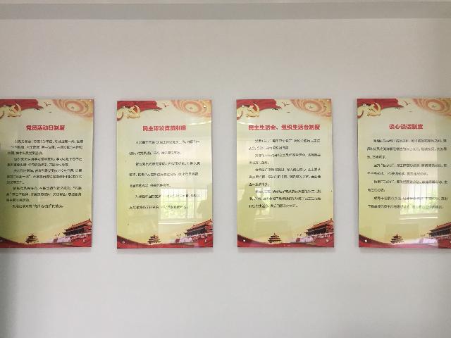 黨員活動(dòng)室在醒目位置特設(shè)主題教育墻,包括黨旗、入黨誓詞、黨員義務(wù)和權(quán)利;顒(dòng)室內(nèi)有8個(gè)宣傳展版,內(nèi)容包括組織架構(gòu)圖、黨委委員崗位職責(zé)、紀(jì)委委員崗位職責(zé)、民主生活會(huì)組織生活會(huì)制度、“三會(huì)一課”制度、民主評(píng)議黨員制度、發(fā)展黨員工作流程圖和黨員活動(dòng)日制度。活動(dòng)室還配備了報(bào)刊書(shū)架,擺放黨員學(xué)習(xí)書(shū)刊雜志等。