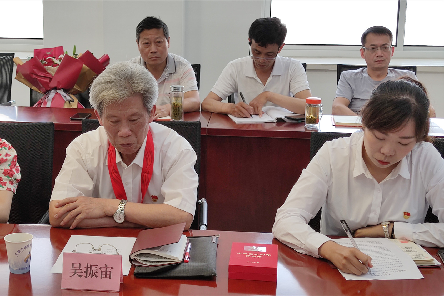 座談會(huì)上,王廷睿、汪冬生向老黨員吳振宙發(fā)放“光榮在黨50年”紀(jì)念章,并敬獻(xiàn)鮮花。王廷睿在講話中指出,在建黨100周年之際,黨中央首次頒發(fā)“光榮在黨50年”紀(jì)念章,充分體現(xiàn)了以習(xí)近平同志為核心的黨中央對(duì)老黨員的關(guān)心、關(guān)懷和褒揚(yáng),進(jìn)一步增強(qiáng)了全體黨員特別是老黨員的榮譽(yù)感、歸屬感、使命感。他強(qiáng)調(diào),集團(tuán)公司各級(jí)黨組織和廣大黨員干部要以習(xí)近平新時(shí)代中國(guó)特色社會(huì)主義思想為指引,繼承發(fā)揚(yáng)黨的優(yōu)良傳統(tǒng)、傳承賡續(xù)黨的紅色基因,胸懷飲水思源的感恩之心,厚植薪火相傳的感激之情,涵養(yǎng)接力前行的感悟之力,擔(dān)當(dāng)時(shí)代使命,開創(chuàng)發(fā)展新局,為集團(tuán)公司改革發(fā)展作出新的更大貢獻(xiàn)。