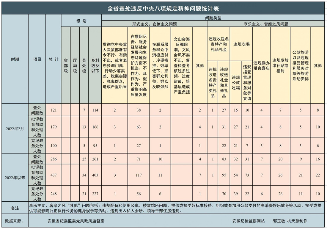 2022年2月,全省紀(jì)檢監(jiān)察機(jī)關(guān)共查處違反中央八項(xiàng)規(guī)定精神問題121起,批評(píng)教育幫助和處理179人(含黨紀(jì)政務(wù)處分100人),同比分別下降30.1%、24.2%、16.0%。