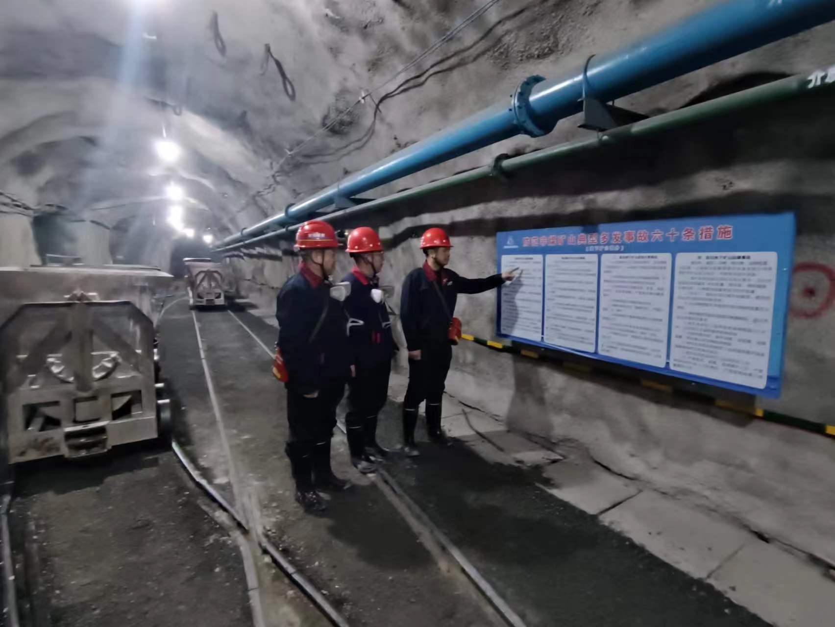 汪冬生一行深入付老莊鐵礦井下-440m主巷,檢查了有軌運(yùn)輸系統(tǒng)、溜礦井、避災(zāi)硐室等地點(diǎn)并沿著新開通的斜坡道,步行進(jìn)入-560米水平,沿途查看二期開拓工程質(zhì)量和施工進(jìn)度情況;聽取了富凱公司負(fù)責(zé)人針對(duì)礦山安全生產(chǎn)制度措施落實(shí)情況、安全防范工作部署落實(shí)情況、風(fēng)險(xiǎn)隱患排查整治及管控措施落實(shí)、教育培訓(xùn)和應(yīng)急演練等情況匯報(bào)。