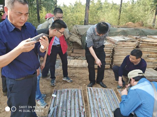 3日下午,詹德光一行來到項目現(xiàn)場,聽取了項目負責人對項目勘查情況及取得的初步成果介紹,同時對正在施工的鉆探巖心進行了查看。4日上午至322隊位于宣城市的化驗室調取了部分樣品,之后又驅車至馬鞍山322隊巖心庫,對品位較高的部分鉆孔巖心進行查看。